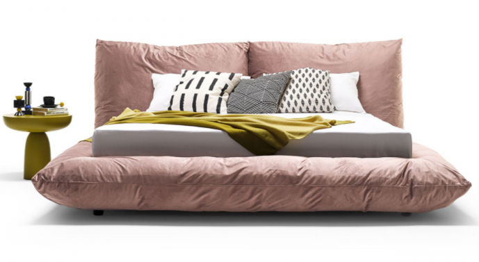 Double bed with upholstered structure characterized by soft lines, large, comfortable and reassuring volumes.