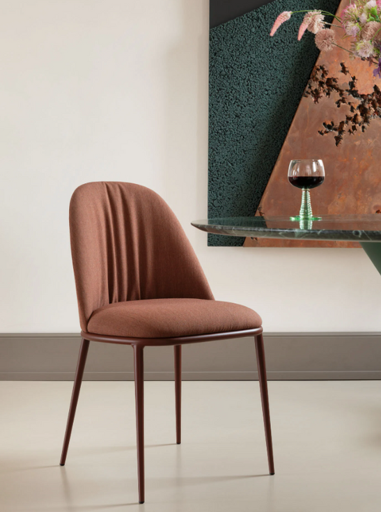 Lea Deluxe chair with four leg base in metal. Seat and backrest upholstered in fabric, hide, or faux hide customizable with different fabric or color for front and back. The Deluxe version has an elegant, draped manufacturing. Its memory foam padding gives an extra softness and comfort.