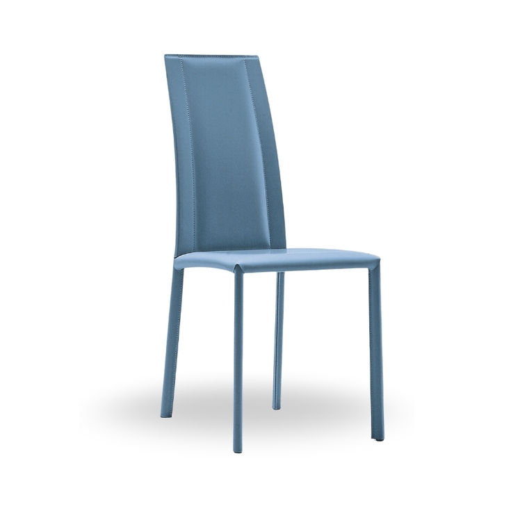 The Silvy chair has a four-legged base and is fully upholstered in hide, faux hide, or fabric. The chairs are stackable up to four units.